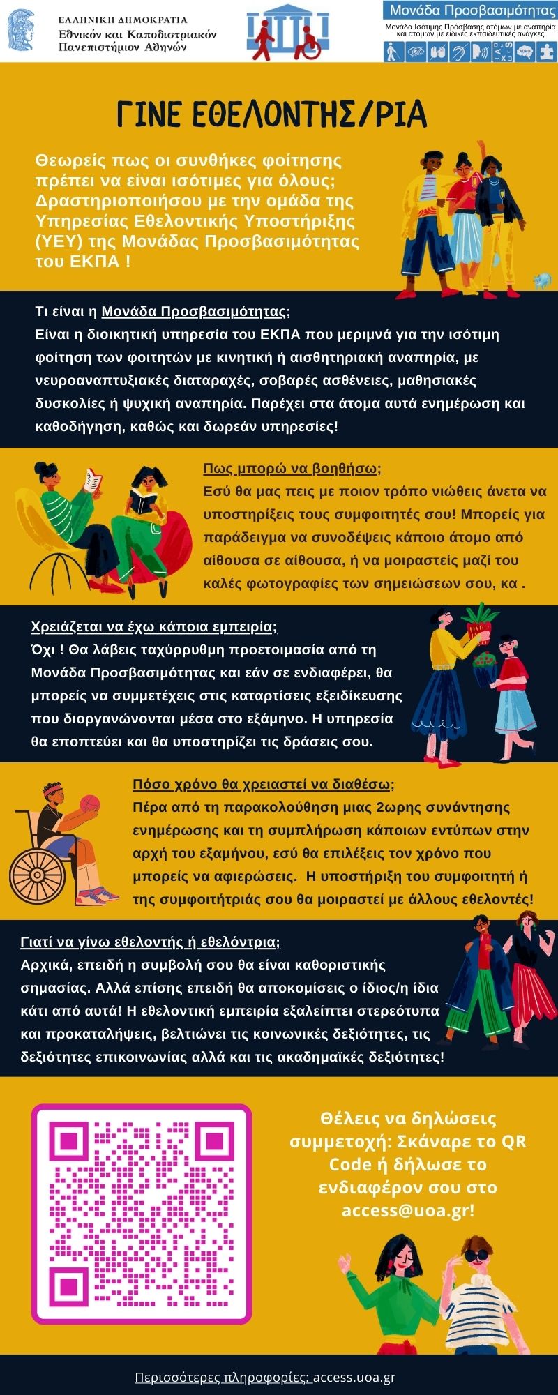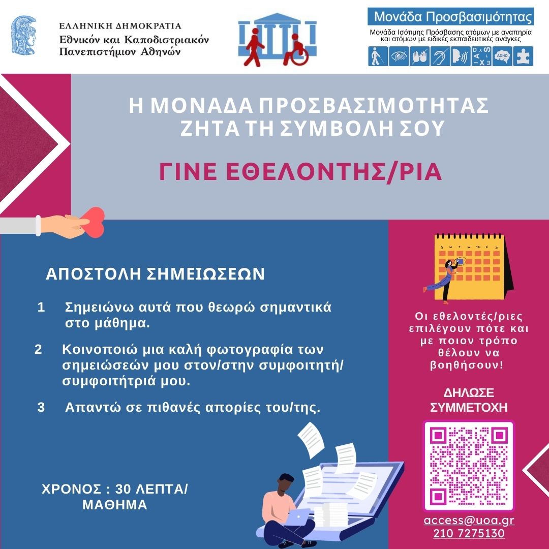 Η Μονάδα Προσβασιμότητας του ΕΚΠΑ αναζητά άτομα, πρόθυμα να υποστηρίξουν συμφοιτητες/-τριες με μαθησιακές δυσκολίες.